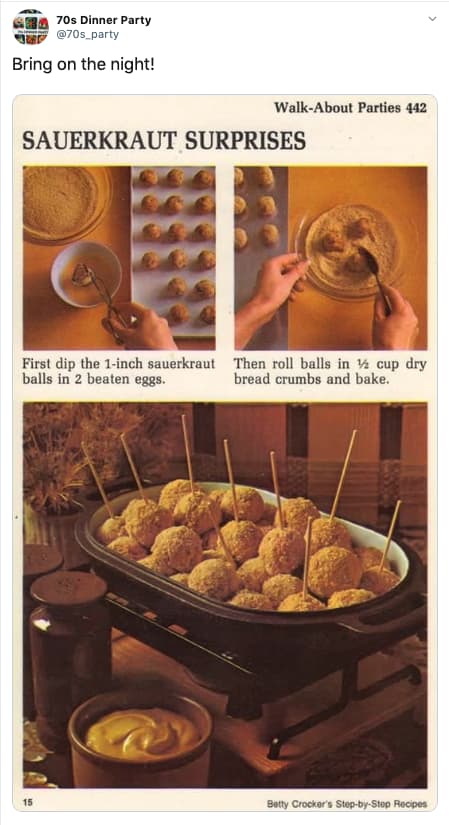 The plan is to have a 1970s dinner party tonight. Pallai's account, 70s dinner party (@70s_party), has 106,000 twitter followers and counting, and no wonder. With the '70s decor back in vogue, you can easily find lava lamps, brightly colored napkins and even '70s music to give your party that unique '70s feel. 01, 2019 these retro dinner recipes will make you feel nostalgic for the 1970s, back to a time when all you needed to worry about was being home before dark (on your banana seat bicycle). We've lost the true meaning of salad:
